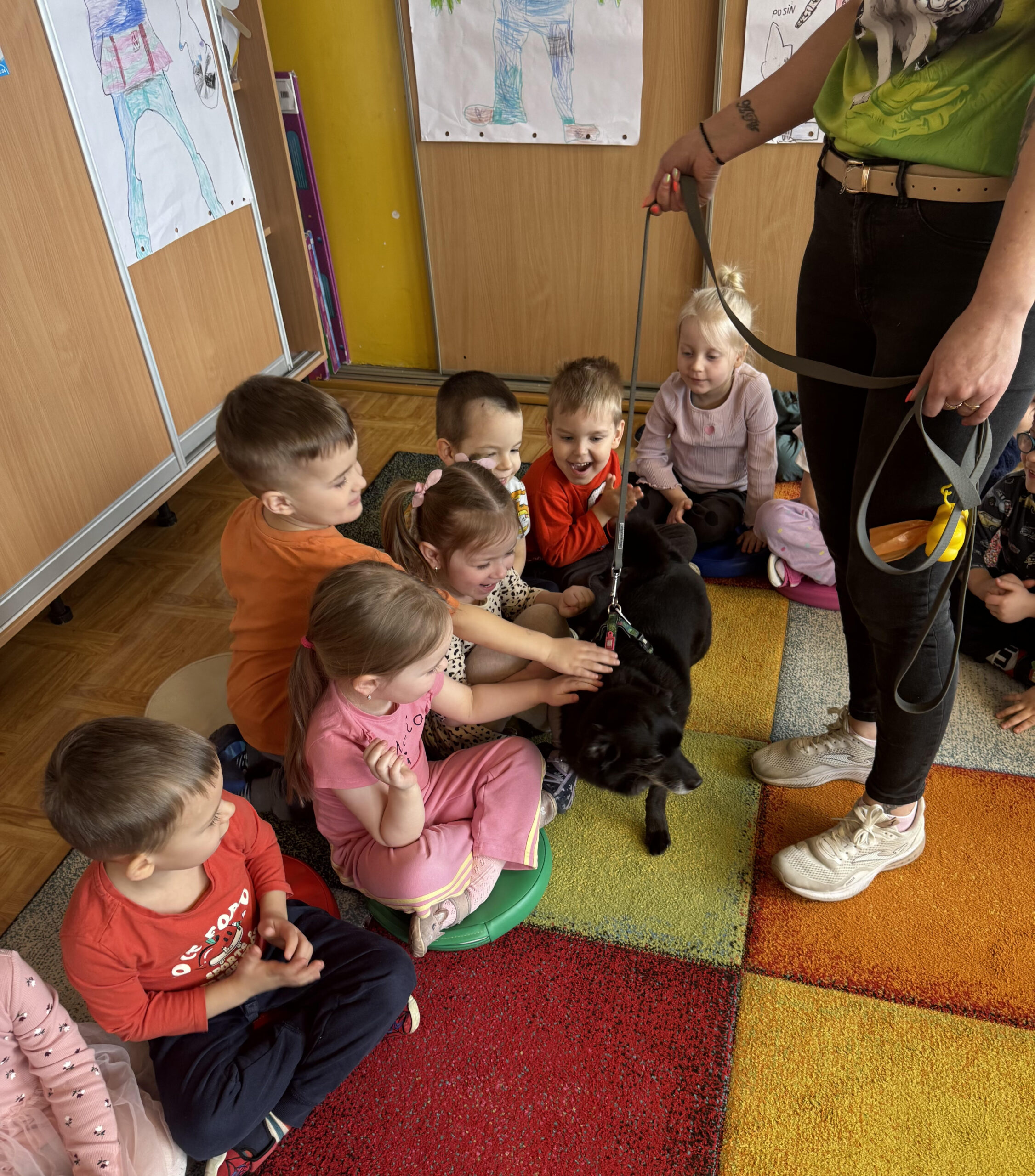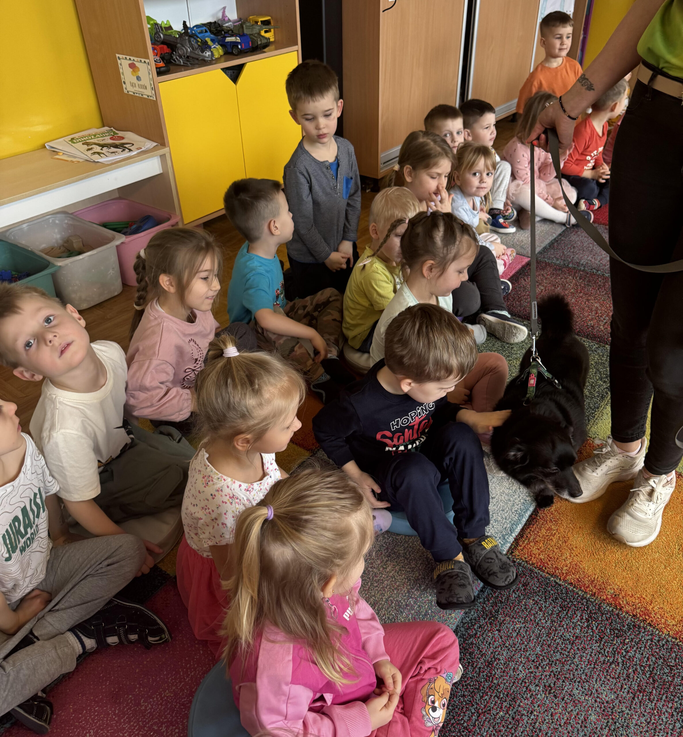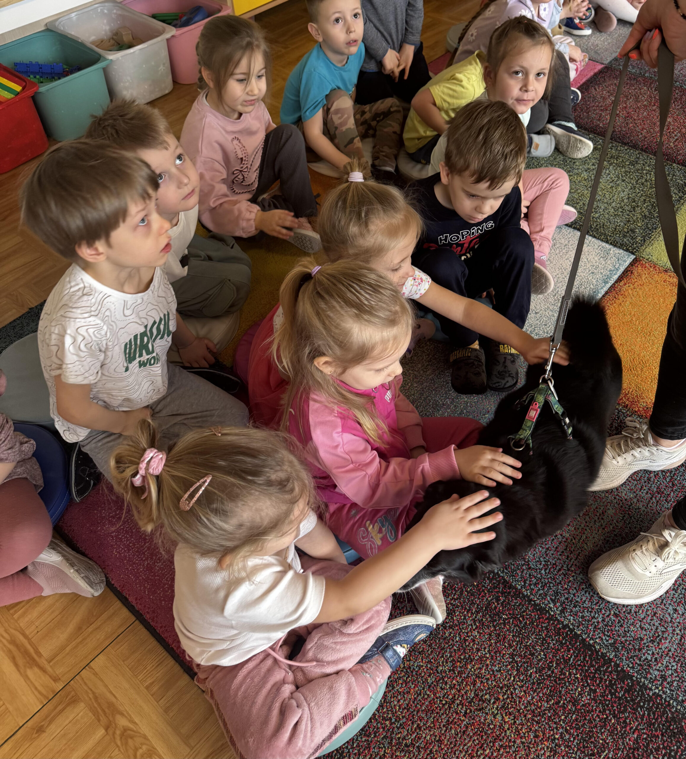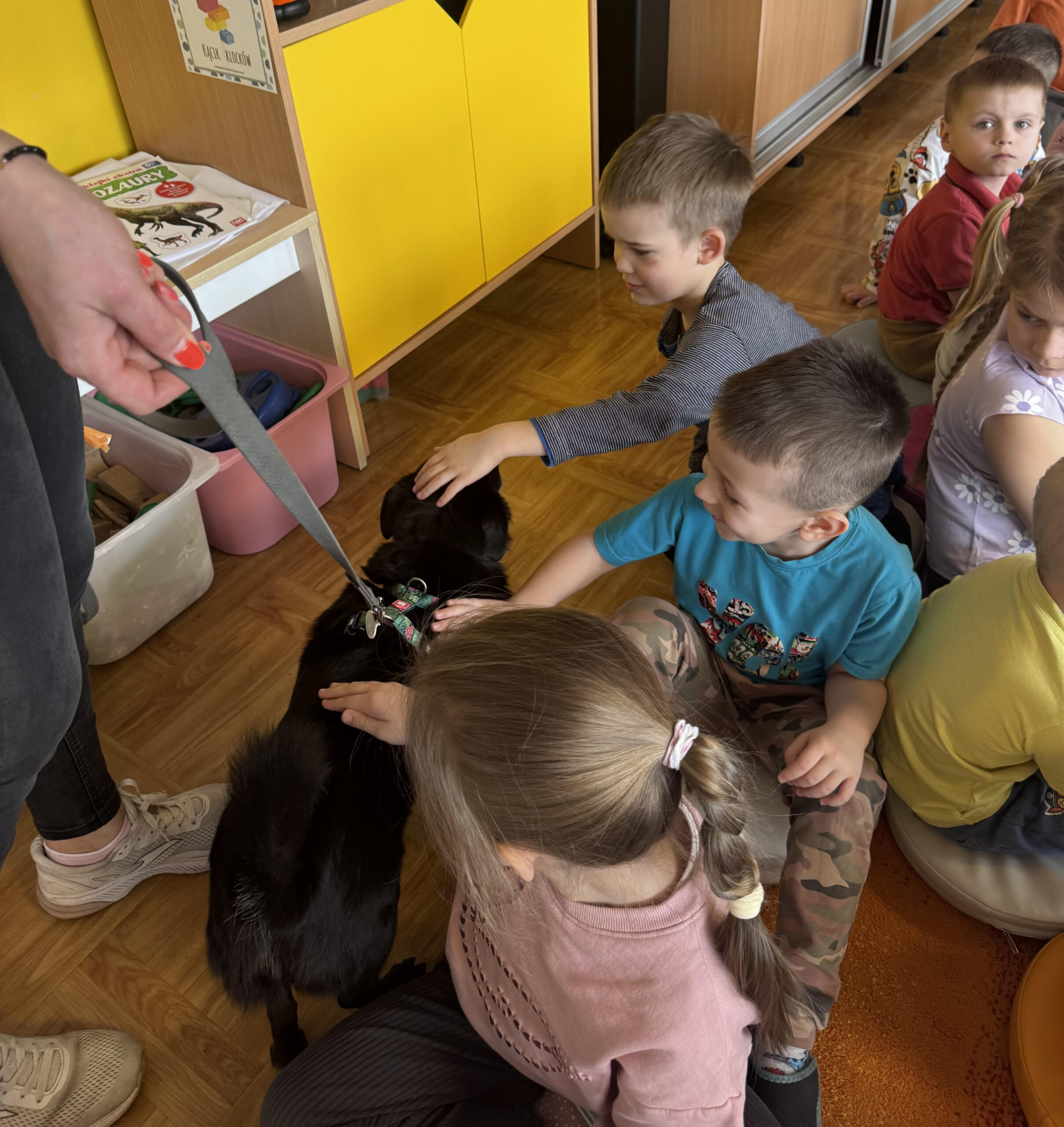 2 marca nasze przedszkole odwiedził wyjątkowy gość – pracownik schroniska Psitul Mnie wraz z uroczym pieskiem Murzynek. Dzieci miały okazję dowiedzieć się, jak prawidłowo opiekować się zwierzętami, jak bezpiecznie zachowywać się w obecności psa oraz dlaczego warto pomagać zwierzętom ze schroniska. Spotkanie wywołało wiele radości i ciekawości, a możliwość poznania pieska była dla naszych przedszkolaków niezapomnianym przeżyciem.